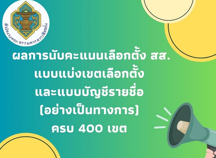 เมื่อวันที่ 18 ก.พ.69 สำนักงานคณะกรรมการการเลือกตั้ง (กกต.) เผยแพร่ผลการนับคะแนนเลือกตั้ง สส. แบบแบ่งเขตเลือกตั้ง และแบบบัญชีรายชื่อ (อย่างเป็นทางการ) ครบ 400 เขต โดยขอประชาสัมพันธ์ให้ประชาชน ผู้สมัคร และพรรคการเมือง ตรวจสอบรายงานผลการนับคะแนน (อย่างเป็นทางการ) ได้ที่เว็บไซต์สำนักงานคณะกรรมการการเลือกตั้ง (www.ect.go.th) หรือเว็บไซต์สำนักงานคณะกรรมการการเลือกตั้งประจำจังหวัดทุกจังหวัดหรือกรุงเทพมหานคร ครบจำนวน 400 เขต โดยมีรายละเอียดดังนี้