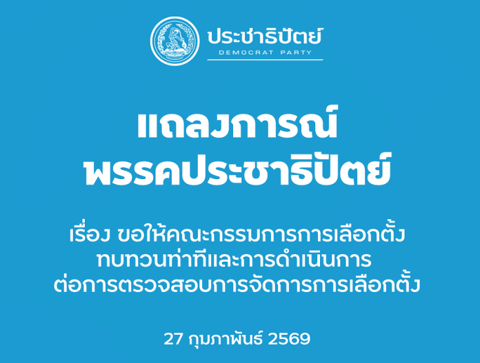 เมื่อวันที่ 27 ก.พ.69 พรรคประชาธิปัตย์ได้ออกแถลงการณ์เรื่อง ขอให้คณะกรรมการการเลือกตั้ง ทบทวนท่าทีและการดำเนินการต่อการตรวจสอบการจัดการการเลือกตั้ง โดยระบุว่าจากข่าวที่คณะกรรมการการเลือกตั้งมอบอำนาจให้รองเลขาธิการคณะกรรมการการเลือกตั้งเข้าแจ้งความกองปราบปราม ให้ดำเนินคดีกับกลุ่มบุคคลที่ร่วมกันตรวจสอบ กรณีข้อสงสัยเรื่องบาร์โค้ดบนบัตรเลือกตั้ง เมื่อวันที่ ๒๒ กุมภาพันธ์ ที่ผ่านมานั้น