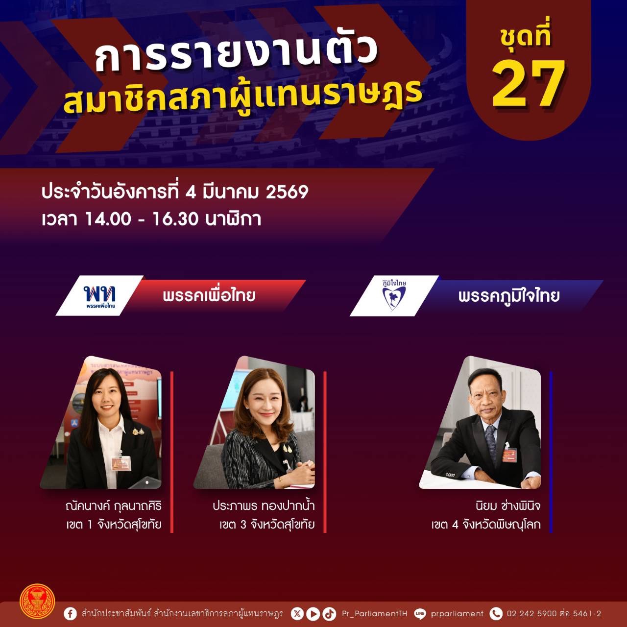 วันที่ 4 ก.พ.2569 ที่รัฐสภา ผู้สื่อข่าวรายงานว่า สำหรับบรรยากาศการรายงานตัว สส.เขต ยังคงเป็นไปอย่างต่อเนื่อง ทั้งนี้มีผู้ที่มารายงานตัวเป็นคนแรกคือ นายอัครเดช วงษ์พิทักษ์โรจน์ สส.ราชบุรี เขต 4 พรรคภูมิใจไทย ต่อมานายวรายุทธ จงอักษร สส.ยโสธร เขต 2 พรรคภูมิใจไทย