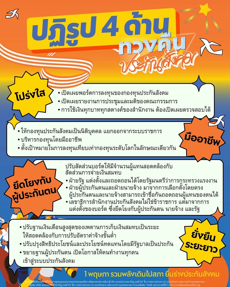 วันแรงงานปีนี้ พรรคประชาชนจึงยื่นร่างแก้ไข พ.ร.บ.ประกันสังคม ปฏิรูปกองทุนประกันสังคมทั้งระบบใน 4 ด้านสำคัญ เพื่อให้กองทุนที่เกิดขึ้นจากการต่อสู้ของประชาชน ดำรงอยู่เพื่อเป็นหลักพิงของคนทำงานตามหลักการ “เฉลี่ยทุกข์เฉลี่ยสุข” สามารถอยู่ได้อย่างยั่งยืนท่ามกลางความเปลี่ยนแปลง