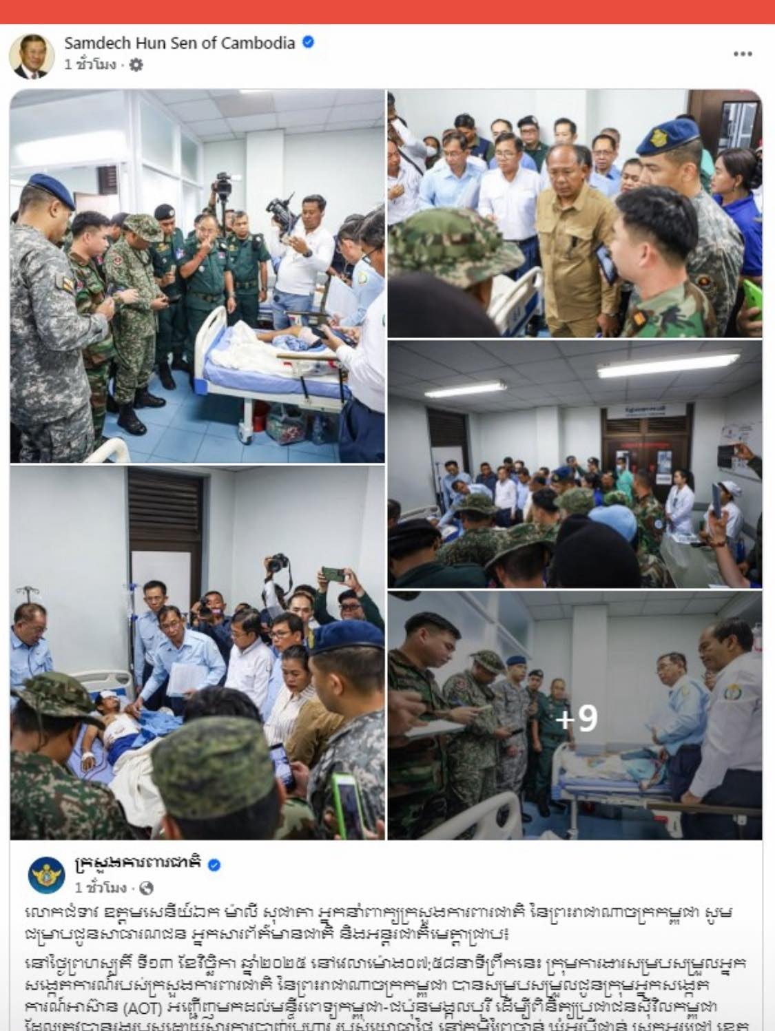 เมื่อวันที่ 13‘ฮุน เซน’ แชร์ โพสต์กระทรวงกลาโหมกัมพูชา ขณะพาคณะ AOT ลงพื้นที่ โรงพยาบาลกัมพูชา-ญี่ปุ่น มงคล บอเรย์ เยี่ยมผู้บาดเจ็บเหตุบ้านเปรยจัน