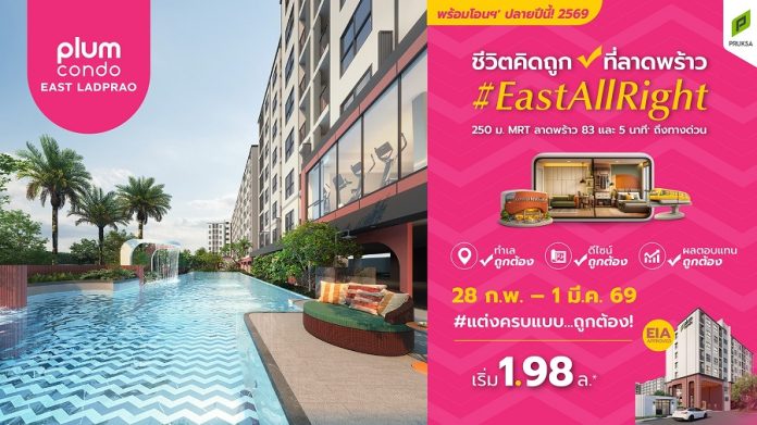 East All Right! “พฤกษา” เปิดจองคอนโดใหม่..พร้อมโอนสิ้นปีนี้ ที่ “พลัมคอนโด อีสต์ ลาดพร้าว”ให้ชีวิตคิดถูกทุกด้าน ใจกลางลาดพร้าว ฟรีเฟอร์ครบฯ พร้อมผ่อนเบาพันกว่าบาท เริ่มเพียง 1.98 ล้าน* 28 ก.พ. – 1 มี.ค. นี้ เท่านั้น