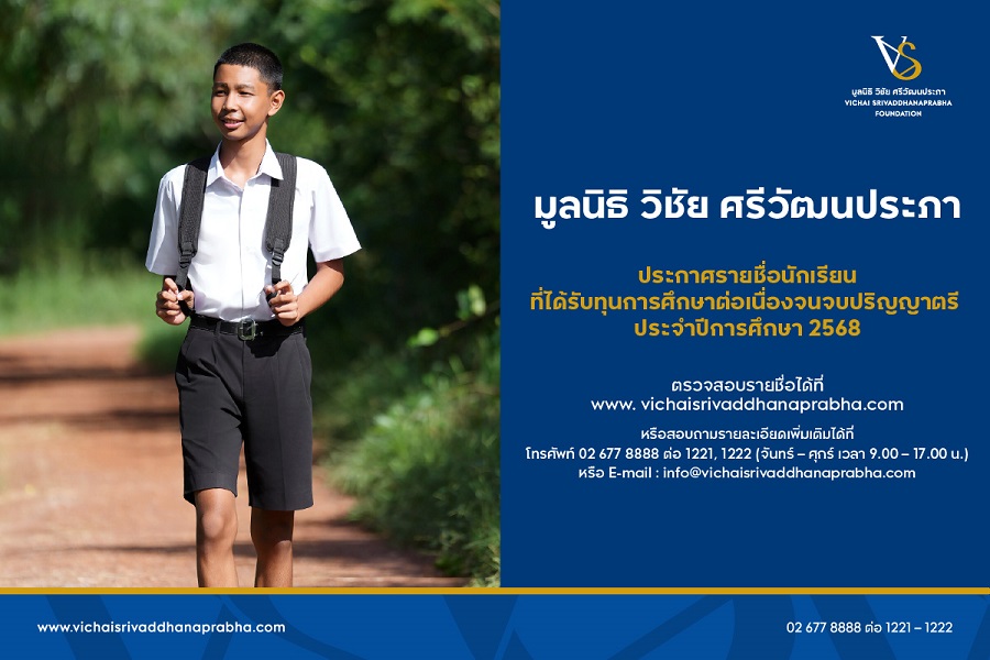 ซึ่งผู้ที่ได้รับทุนการศึกษาจะได้รับการติดต่อจากมูลนิธิฯ หรือ สามารถตรวจสอบรายชื่อได้ที่ www.vichaisrivaddhanaprabha.com หรือ สอบถามรายละเอียดเพิ่มเติมได้ที่ โทรศัพท์ 02 677 8888 ต่อ 1221 , 1222 (จันทร์ – ศุกร์ เวลา 09.00 – 17.00 น.) หรือ E-mail : [email protected]