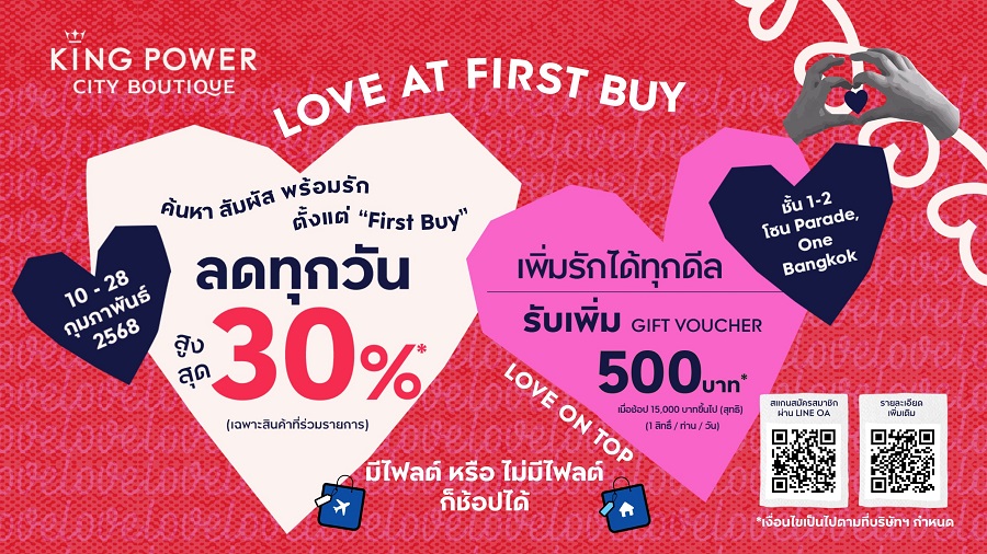 คิง เพาเวอร์ ซิตี บูทีก ที่สุดแห่งประสบการณ์ช้อปมิติใหม่ใจกลางเมือง มีไฟลต์บินหรือไม่มีไฟลต์บินก็ช้อปได้ เนรมิตคลับแห่งความรักต้อนรับเทศกาลวาเลนไทน์ จัดงาน “LOVER’S BOUTIQUE” มอบประสบการณ์สุดพิเศษในบรรยากาศโรแมนติก พลาดไม่ได้เติมความหวานบริหารความเลิฟในวันแห่งความรัก วันที่ 14 กุมภาพันธ์ 2568 ด้วยเสียงเพลงจาก Music Lover’sAmbient จาก Cupnoodlemusic และ DJ ตลอดทั้งวันวาเลนไทน์ ที่จะทำให้ทุกความรัก ทุกความสัมพันธ์กลับมาใจฟูอีกครั้ง ภายในงานช้อปครบ 5,000 บาทขึ้นไป หรือแลก 200 กะรัต รับสิทธิ์สนุกกับกิจกรรม PAINTING PAPER FLOWER ศิลปะการรังสรรค์ดอกไม้กระดาษที่สามารถออกแบบสีสันได้ตามใจ เสมือนประติมากรรมแห่งความรักที่มีเพียงหนึ่งเดียวในโลก, ช้อปครบ 3,500 บาทขึ้นไป หรือแลก 100 กะรัต รับทันที แจกันดอกไม้ LOVER’S VASE, กิจกรรมดูดวงสมพงศ์ LOVER’S HOROSCOPE โดยทีมผู้เชี่ยวชาญจากน่ำเอี๊ยง กรุ๊ป เช็คระดับดวงสมพงศ์ พร้อมแนวทางกระชับความสัมพันธ์ของคุณและคนรักให้มั่นคงยืนยาว เพียงแสดงใบเสร็จเมื่อช้อปสินค้าใน KING POWER CITY BOUTIQUE ไม่มีขั้นต่ำ ได้ทั้งสินค้าป้ายขาว สินค้าที่ต้องช้อปก่อนบินรับของที่สนามบิน หรือสินค้าป้ายฟ้า สินค้าที่ไม่ต้องบินซื้อแล้วรับกลับได้ทันที