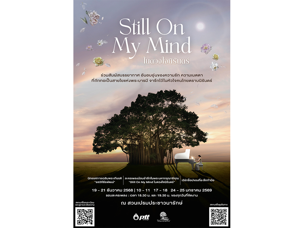 เพื่อน้อมรำลึกในพระมหากรุณาธิคุณอันหาที่สุดมิได้ ของสมเด็จพระนางเจ้าสิริกิติ์ พระบรมราชินีนาถ พระบรมราชชนนีพันปีหลวง กลุ่ม ปตท. ขอเชิญประชาชนชาวไทย ร่วมรักษา สืบสาน ต่อยอดพระราชปณิธานในการดูแลรักษาทรัพยากรธรรมชาติ สิ่งแวดล้อม สร้างความแข็งแรงทางเศรษฐกิจและความสุขที่ยั่งยืนในการดำเนินชีวิต โดยมีพระองค์ท่านเป็นแรงบันดาลใจ ในงาน “Still On My Mind ในดวงใจนิรันดร์” สัมผัสบรรยากาศ อันอบอุ่นของความรัก ความเมตตา ที่ถักทอเป็นสายใยแห่งพระบารมี จารึกไว้ในหัวใจคนไทย ตราบนิรันดร์ ผ่านการแสดงละครเพลงน้อมรำลึกในพระมหากรุณาธิคุณ นิทรรศการและกิจกรรมเวิร์กช็อปสร้างสรรค์ สื่อถึงพระเมตตาที่ทรงปฏิบัติพระราชกรณียกิจเพื่อประชาชนเสมอมาและสายใยแห่งความรัก ความผูกพันระหว่างพระองค์ท่านกับพสกนิกรไทย ในวันที่ 19-21 ธันวาคม 2568 และต่อเนื่องในช่วงต้นปีใหม่ ระหว่างวันที่ 10-11, 17-18 และ 24-25 มกราคม 2569 เปิดให้ประชาชนเข้าชมอย่างทั่วถึง โดยไม่เสียค่าใช้จ่าย ตั้งแต่เวลา 16.00–21.00 น. ณ สวนเปรมประชาวนารักษ์ พร้อมบรรยากาศสวนยามเย็นที่จะเปลี่ยนสู่ค่ำคืนแสนอบอุ่นและตราตรึงใจ