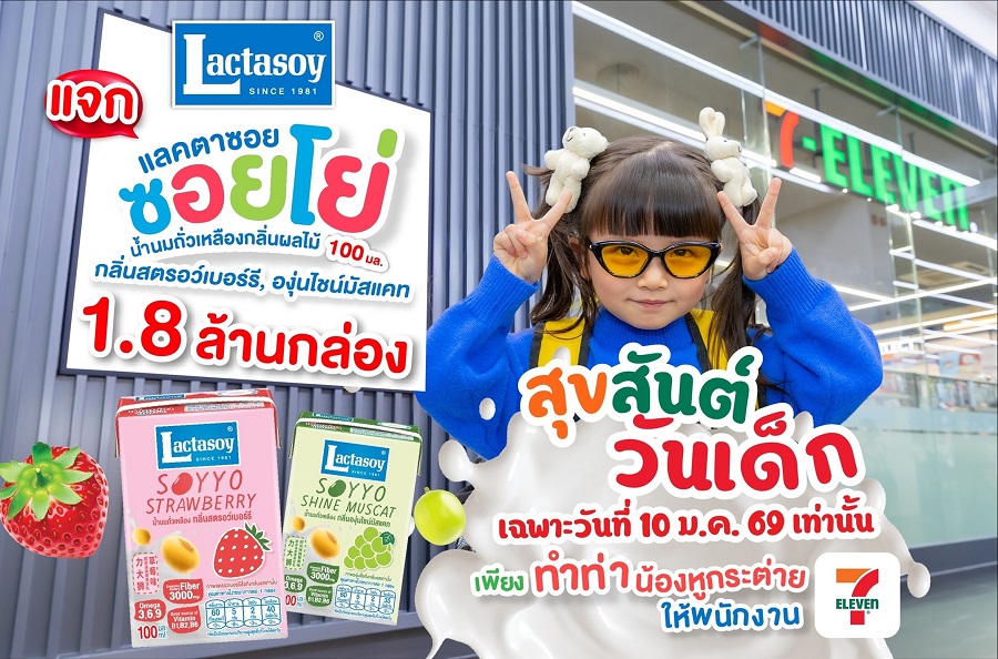 สุขสันต์วันเด็ก แลคตาซอย ใจดี แจกใหญ่ แจกจริง! ส่งความสุขให้เด็กไทยในวันเสาร์ที่ 10 มกราคม 2569 นี้ กับแคมเปญสุดพิเศษมอบ “แลคตาซอย ซอยโย่” นมถั่วเหลืองผสมกลิ่นผลไม้ สตรอว์เบอร์รี่ หวานละมุน และองุ่นไซมัสแคท หอมชื่นใจ ขนาด 100 ml. จำนวน 1,800,000 กล่อง ที่ 7-Eleven เพียงแค่น้องๆ หนูๆ ทำท่า “น้องหูกระต่าย” ชูสองนิ้วไว้ที่หูสองข้างให้พี่พนักงานที่เคาน์เตอร์ดู ก็รับแลคตาซอย ซอยโย่ ฟรีๆ กันไปเลย อย่ารอช้านะ ใกล้ 7-Eleven สาขาไหน รีบพุ่งตัวไปรับความอร่อยและสุขภาพดีกันได้เลย เฉพาะสาขาที่ร่วมรายการ สินค้ามีจำนวนจำกัด 1คน / 1 กล่อง เท่านั้น